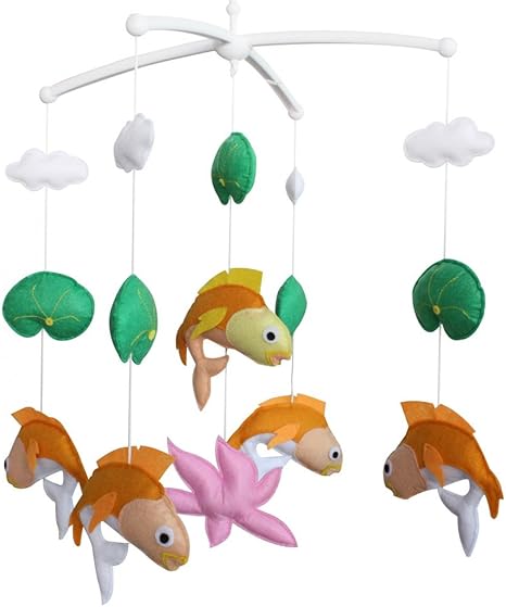 5 out of 5 stars. Has fish and whales winds up to play music. Sold and shipped by lambs & ivy. Under the sea nursery decor, baby boy goldfish cot mobile, denim baby blue light gray white theme. Lucky koi fish and cat nursery decor, wall decor, baby shower gift.